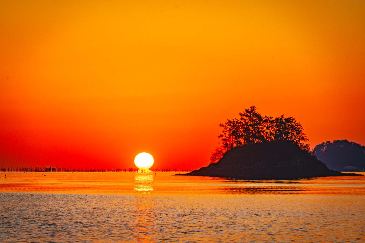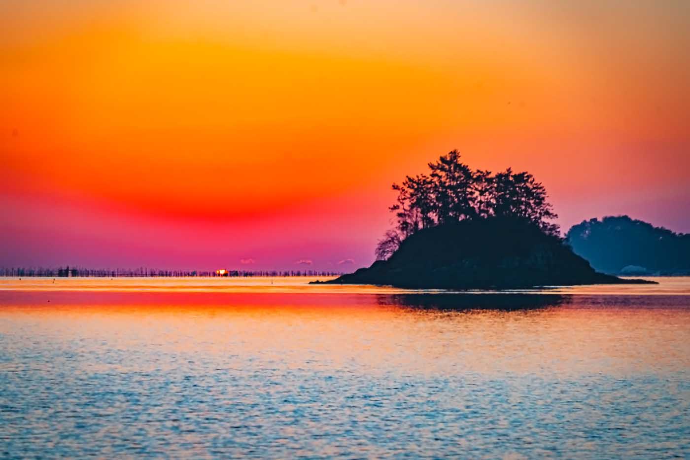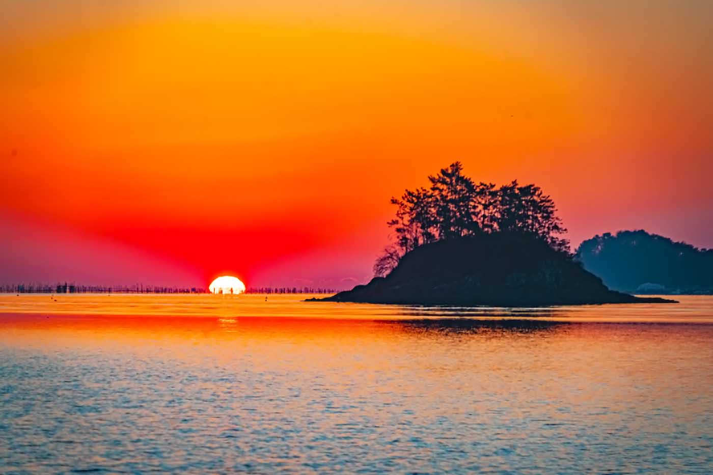 붉은 아침노을에 호수같이 잔잔한 남해 바다와 솔섬과 죽방렴을 배경으로