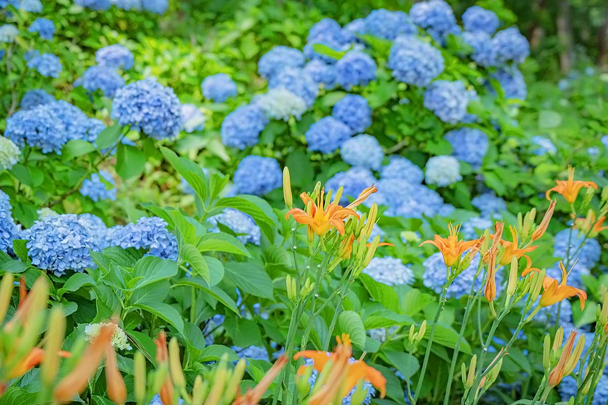 파스텔 톤 수국과 홑왕원추리의 어울림이 황홀경입니다.