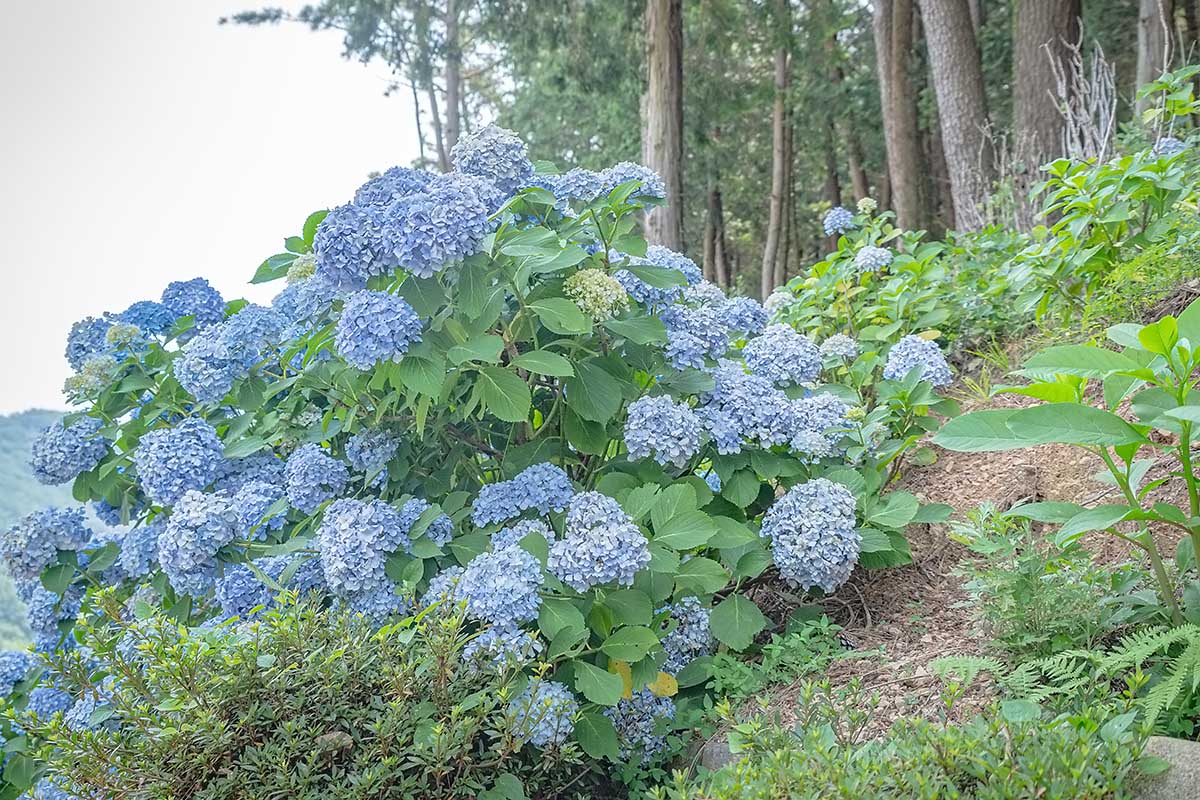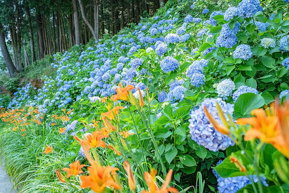 특별한 "수국동산"이 따로 없더라도, 이곳의 산 비탈면을 따라 흐드러지게 핀 수국과