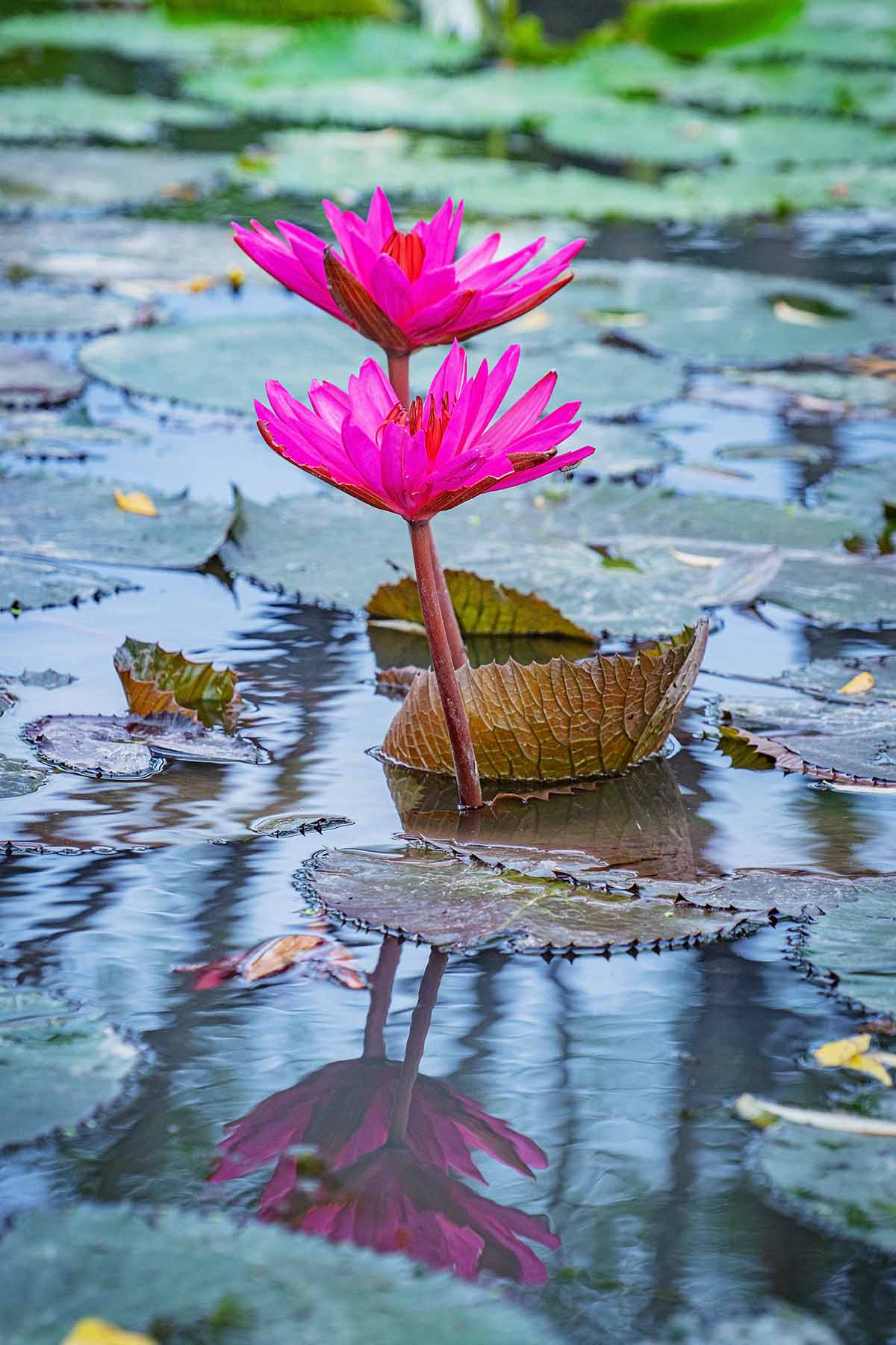 고요한 물 위에 떠 있는 거대한 빅토리아수련은 마치 잠든 연못의 꿈을 꾸는 듯합니다.
