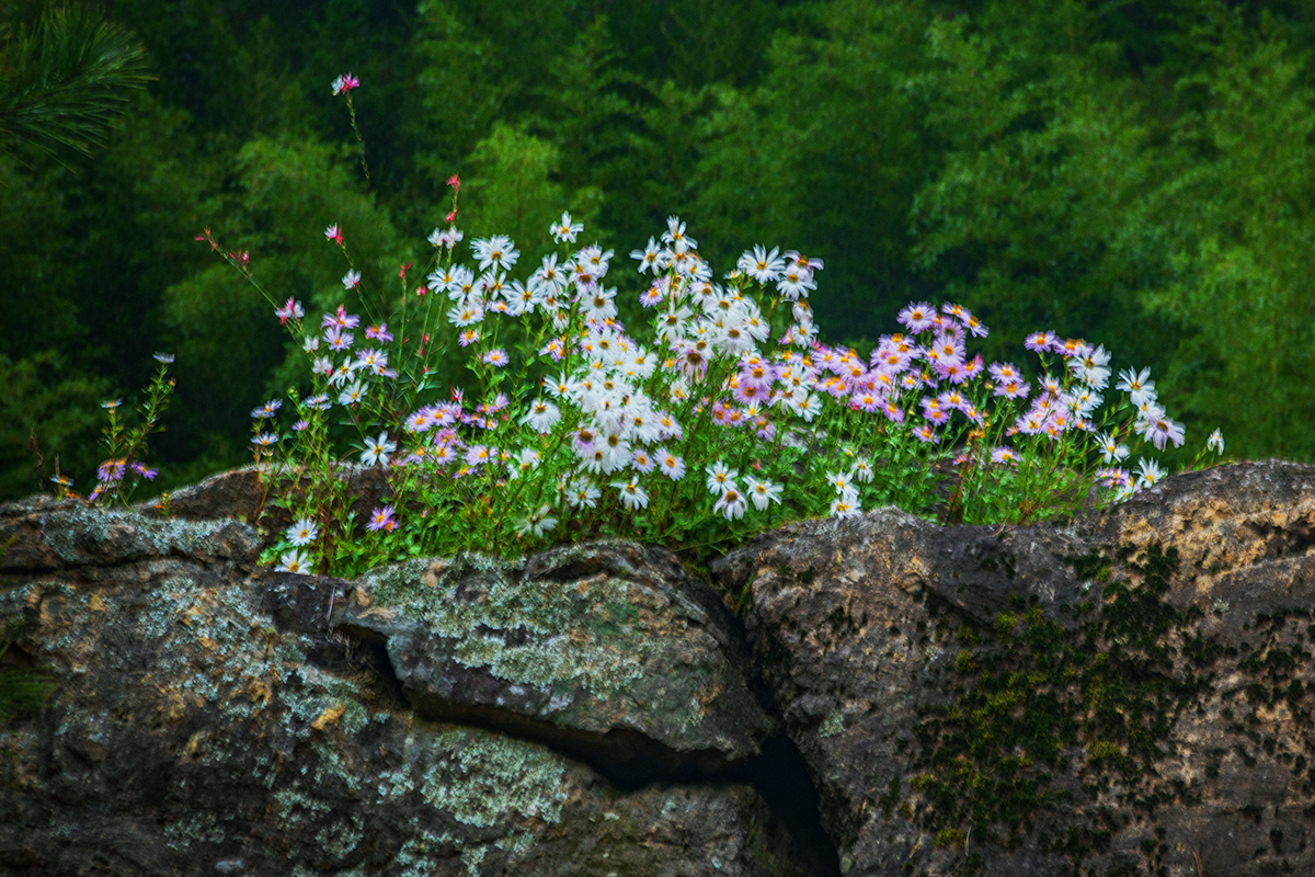 안갯속 송림 사이로 피어난 구절초를 담고 싶어