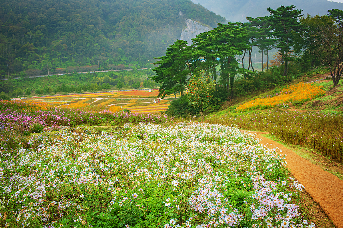구절초 동산 아래 들판엔 황화코스모스, 코스모스, 백일홍 등