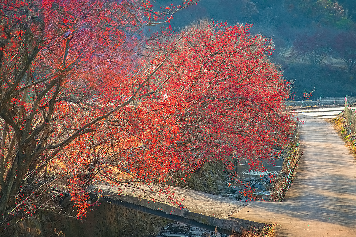 가을의 붉은 산수유는 마음을 차분하게 만드는 따뜻한 풍경을 선사합니다.