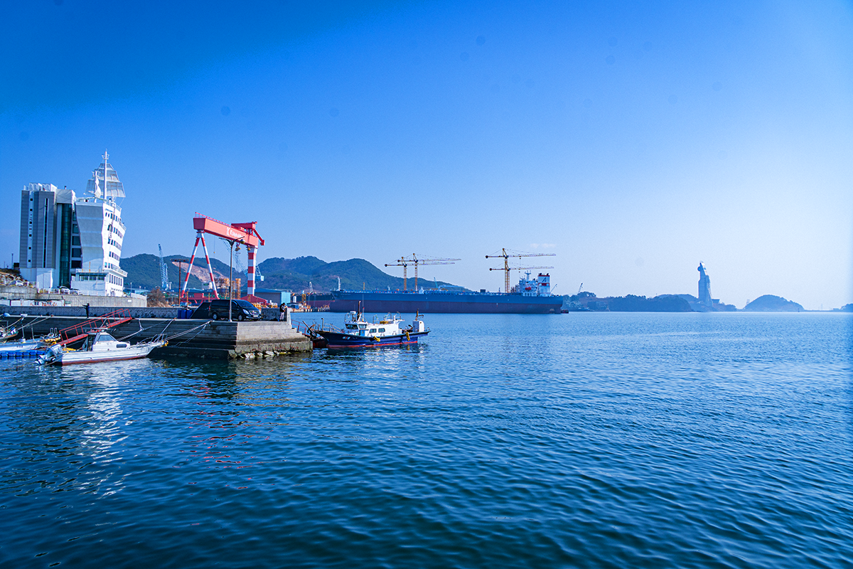 아름다운 삼포항 풍경, 눈앞에는 고요하게 정박한 배들과 잔잔한 물결이 있고,