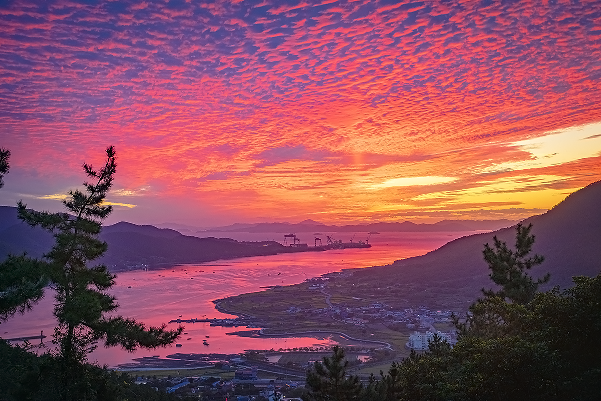 경남 고성 당동만의 여명과 일출 남해의 호수 같은 잔잔한 바다 그래서 간혹 찾아 일출을 즐겨 담아 보는 곳입니다.오늘은 조개 구름이 깔린 날 아침이라서 여명과 노을색이 너무 아름답네요.더