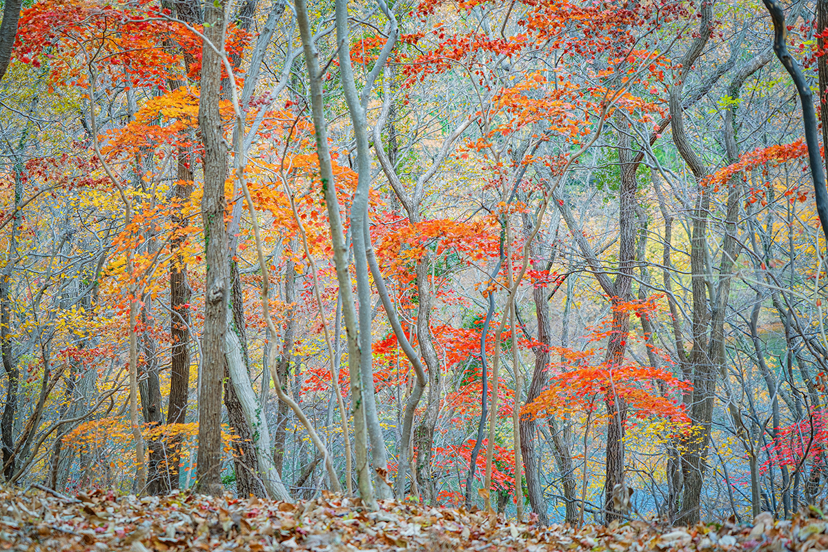 짙은 붉은빛과 노란빛이 서로 어우러져 숲길을 수놓고,