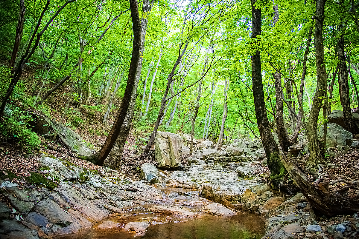 싱그러운 초록빛이 계곡을 따라 부드럽게 번져 있어,