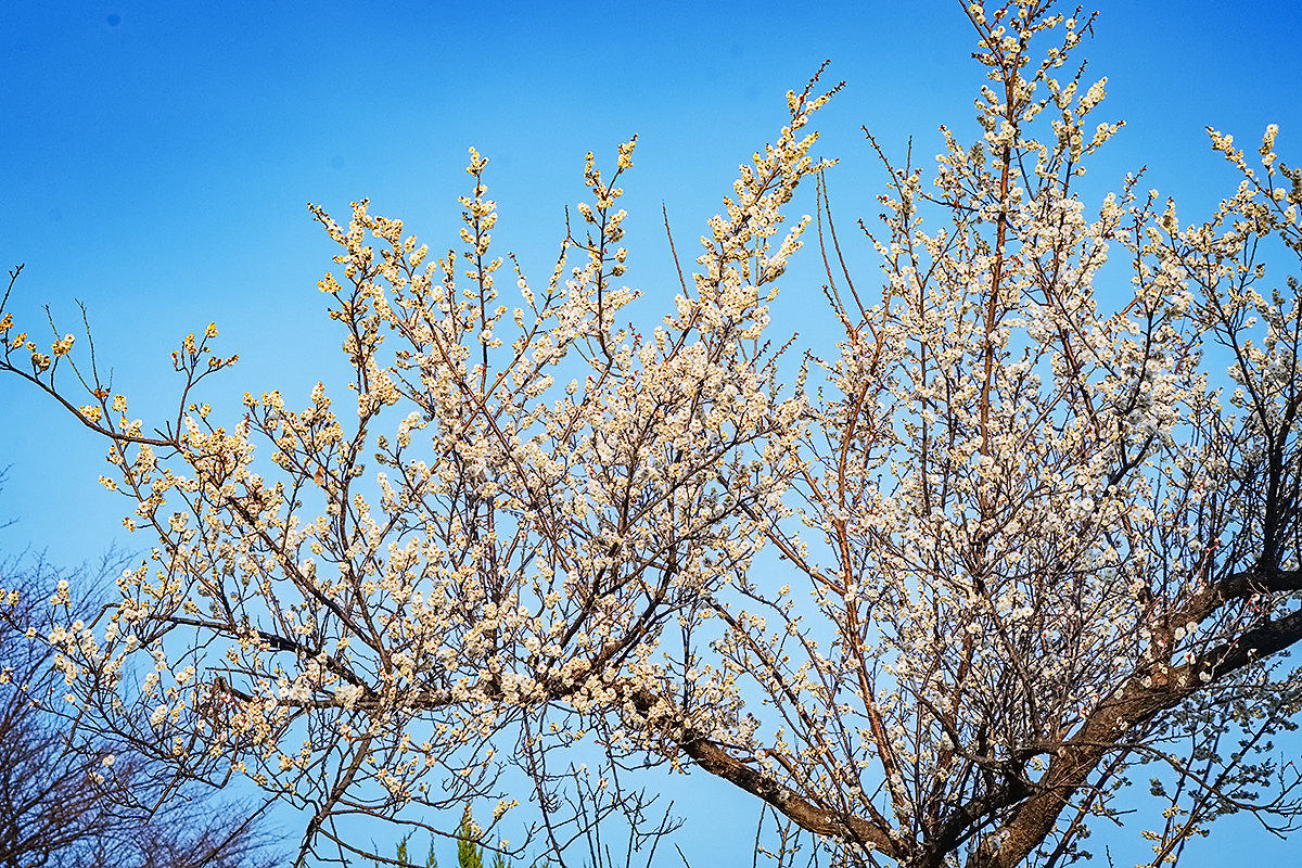 맑은 하늘 아래에서 환하게 피어난 춘당매가