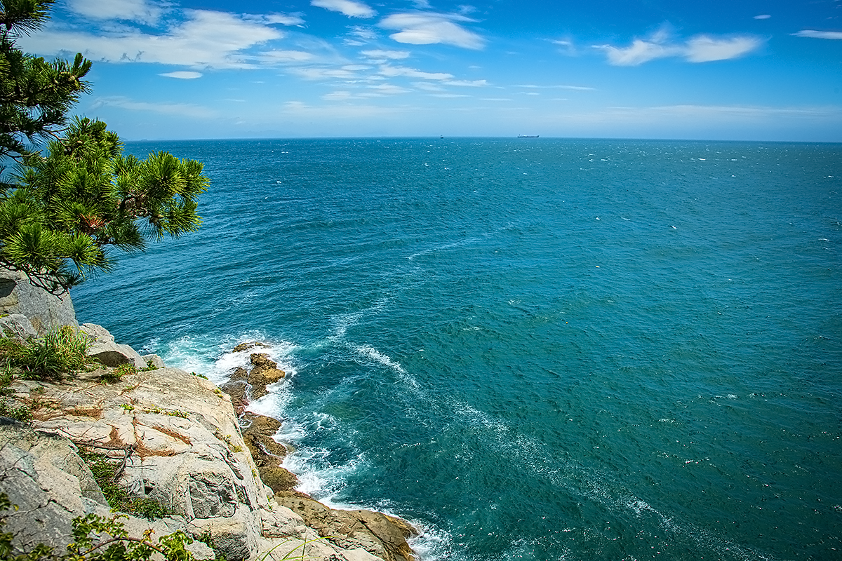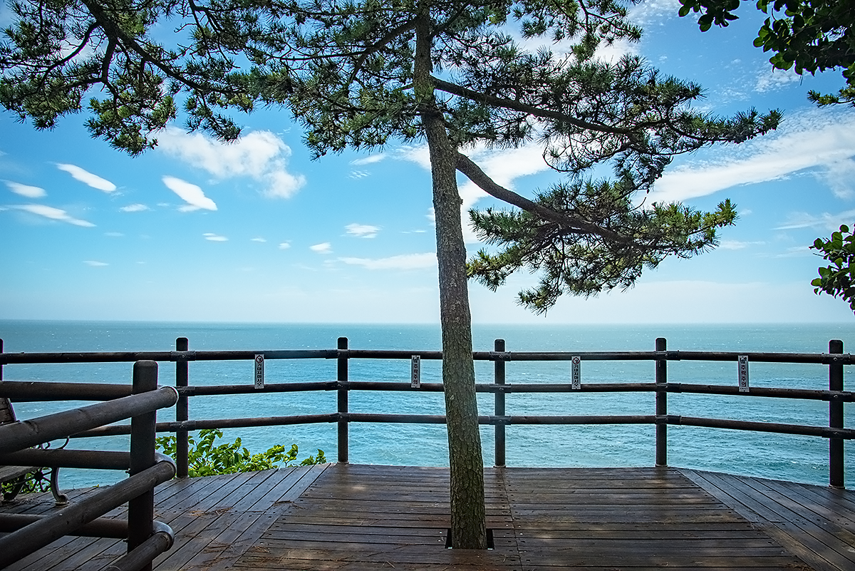 국기 계양대 옆 해식절벽 위에 대한해협의 망망대해를